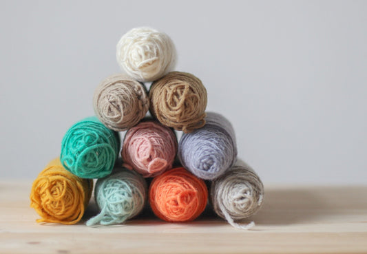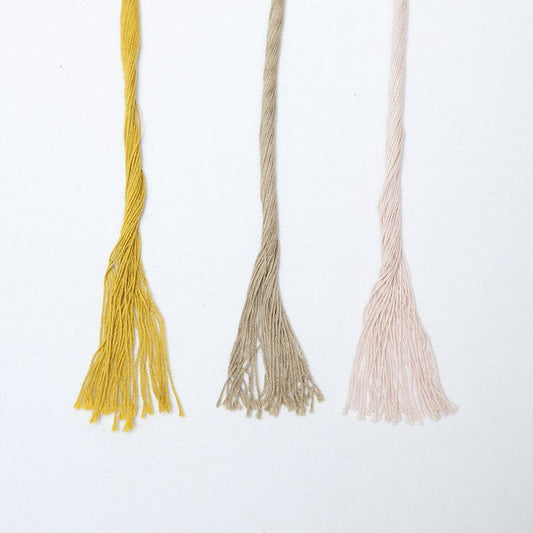 Hilos y cuerdas de algodón ecológico producido en España, lana de oveja trashumante de Castilla y seda reciclada en asociación con mujeres artesanas en India.