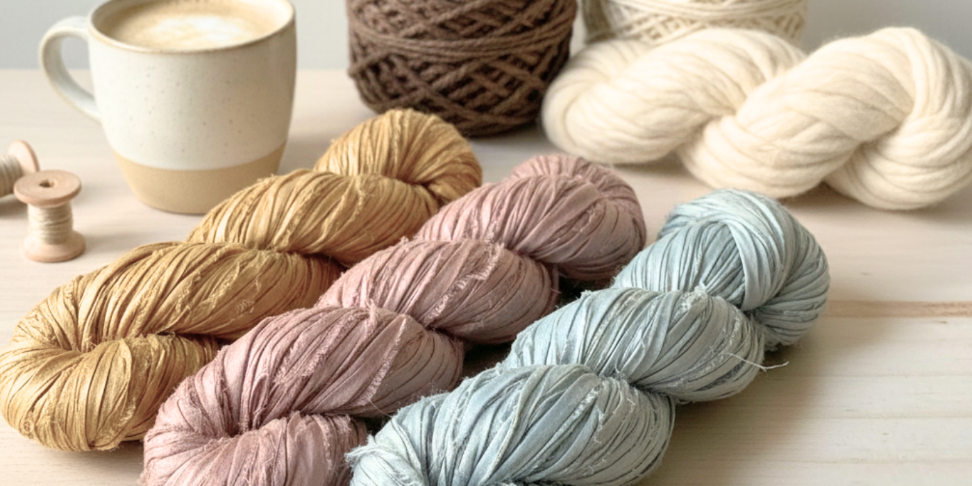 Hilos y cuerdas de algodón ecológico producido en España, lana de oveja trashumante de Castilla y seda reciclada en asociación con mujeres artesanas en India.