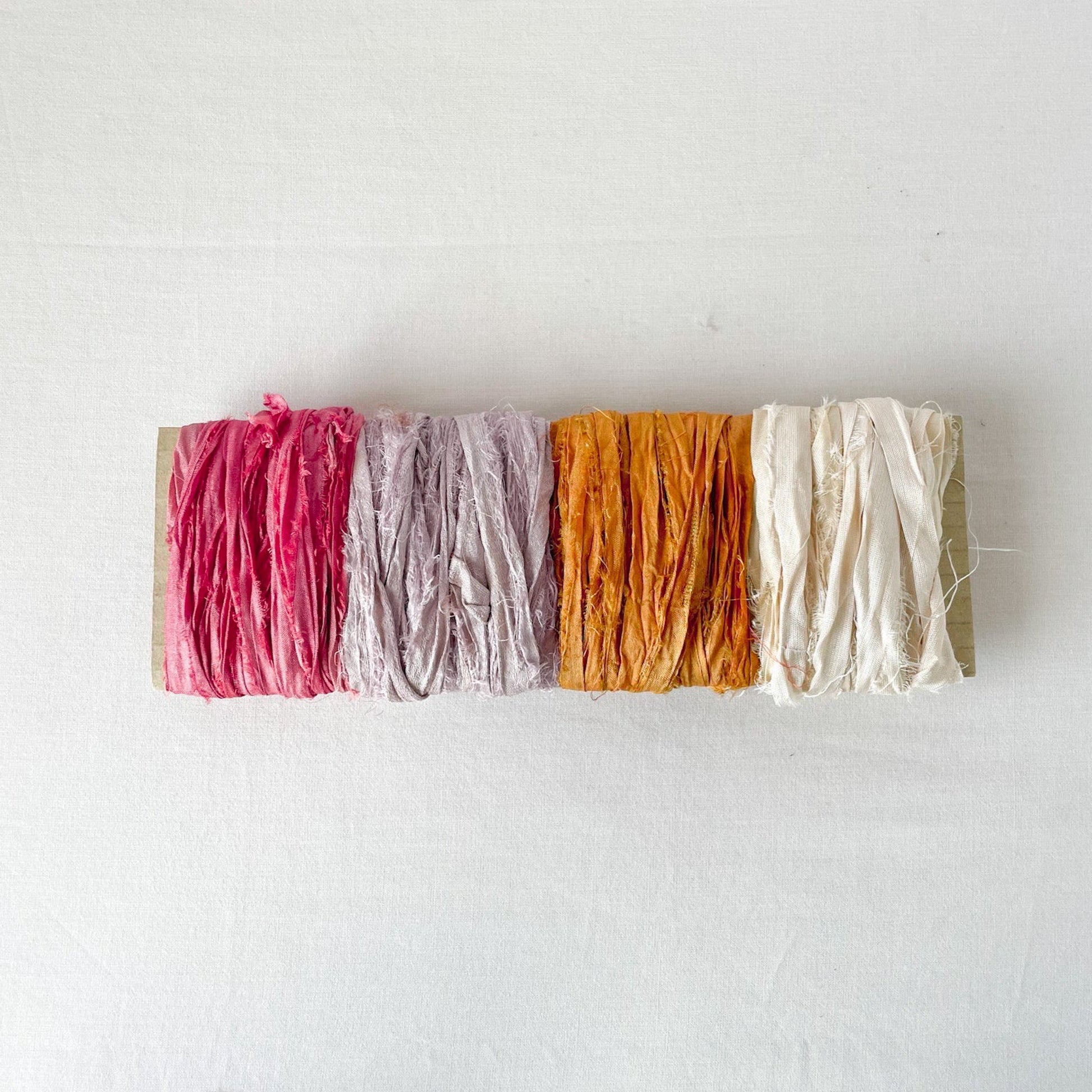 Cada pack contiene una selección curada de cintas de sari de seda recicladas, vibrantes y llenas de color, que combinan sostenibilidad y belleza.